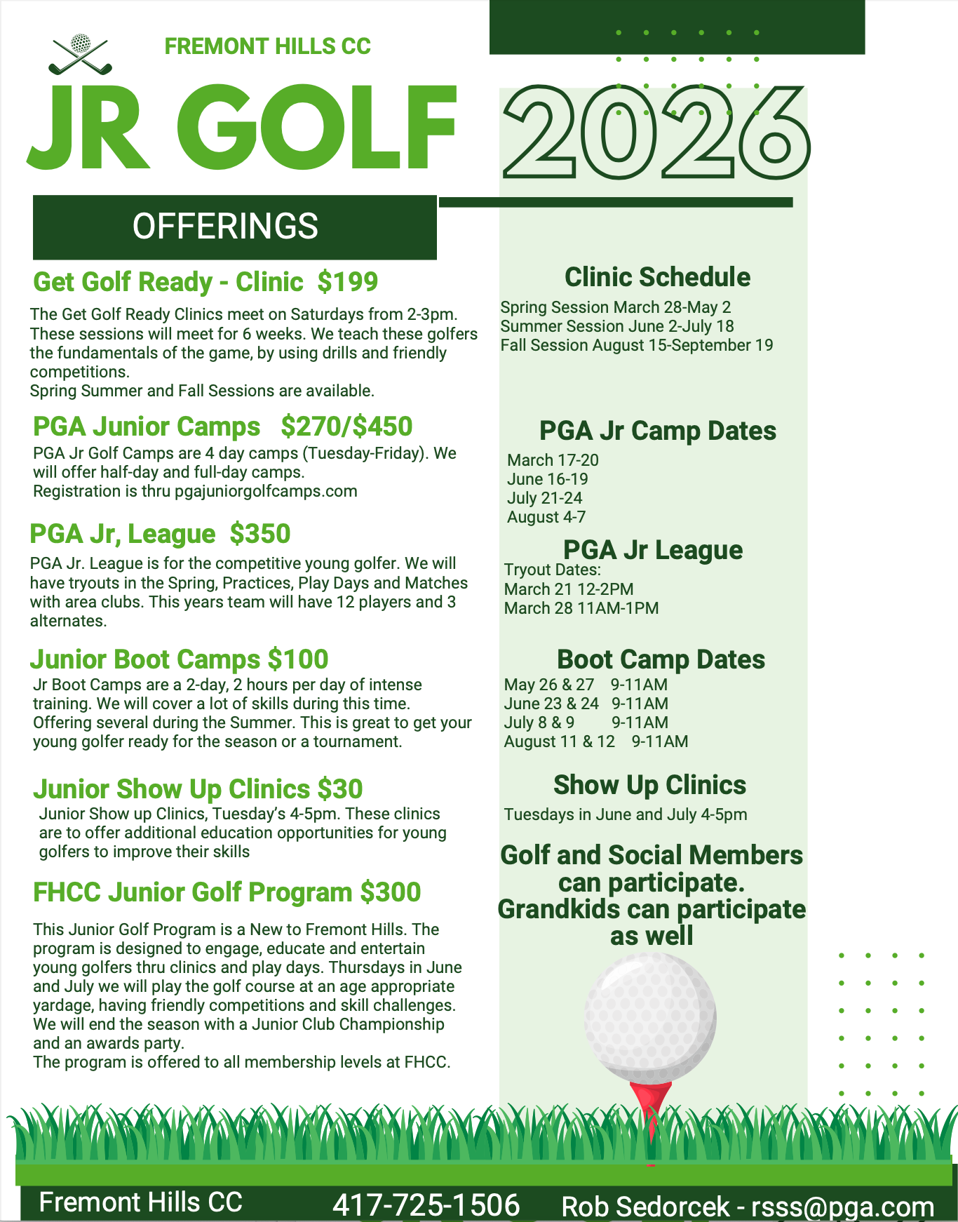 Our Clinics will be offered weekly on Tuesday afternoons. These clinics will be tailored to abilities, age and skill level, and we will be covering specific skills and drills during the clinic. The weekly Skill Clinics will have a specific lesson plan from week to week, that create building blocks for a more fundamentally sound golf game. If you are registered in the FHCC Jr. Golf Program fee is $10 per clinic. Non-Members $30 per clinic.